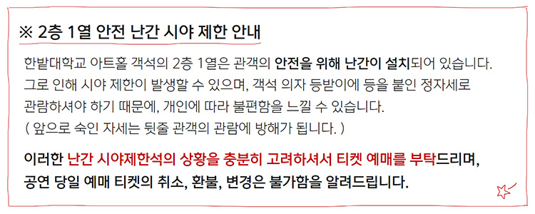 예매가능시간: 관람 10분 전까지 - 목,금: 19:30/ 토요일 15:00, 18:00 (4회공연)