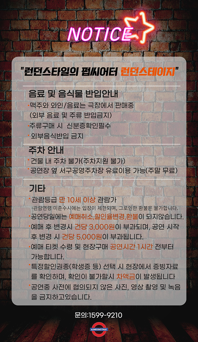 예매가능시간: 관람 10분 전까지 - 화~금 19:30 / 주말 15:00, 18:00 - 매주 월요일 공연 없음